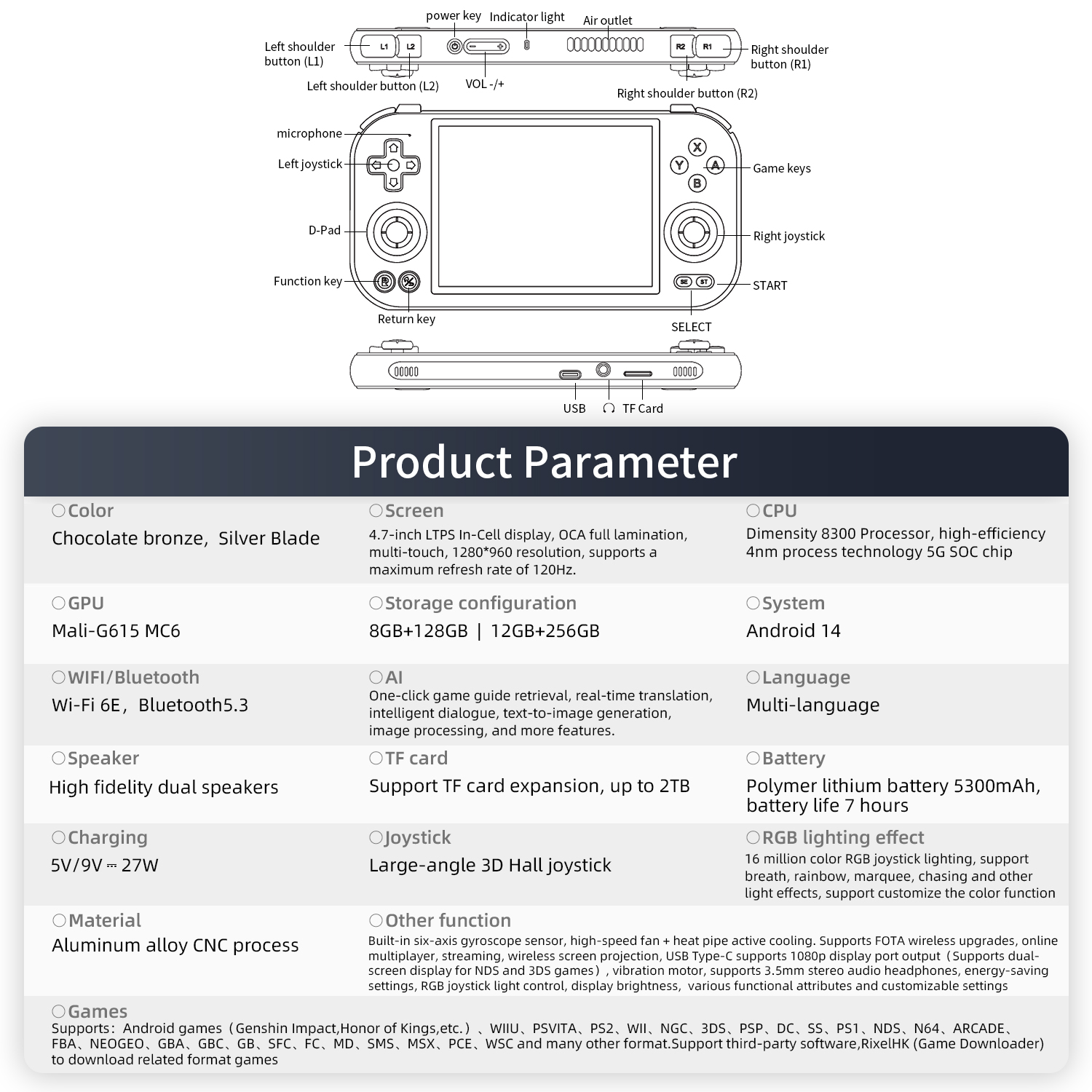 💝Other function:Built-in six-axis gyroscope sensor, high-speed fan + heat pipe active cooling. Supports FOTA wireless upgrades, online multiplayer, streaming, wireless screen projection, USB Type-C supports 1080p display port output(Supports dual-screen display for NDS and 3DS games), vibration motor, supports 3.5mm stereo audio headphones, energy-saving settings, RGB joystick light control, display brightness, various functional attributes and customizable settings.